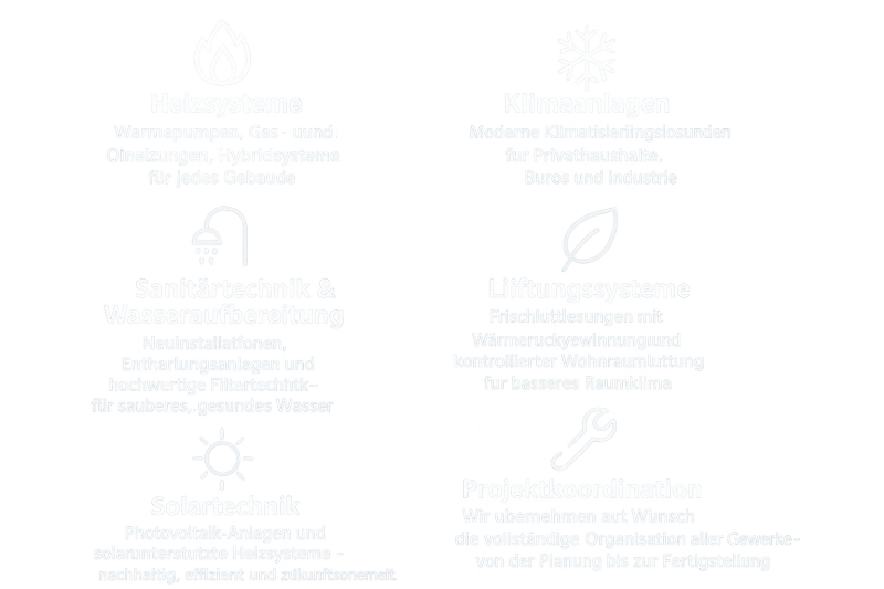 Wir sind spezialisiert auf Heizungssysteme, Klimaanlagen, Sanitärinstallationen, Wasseraufbereitung, Lüftung und Solartechnik – mit Fokus auf Qualität, Effizienz und Kundenzufriedenheit.